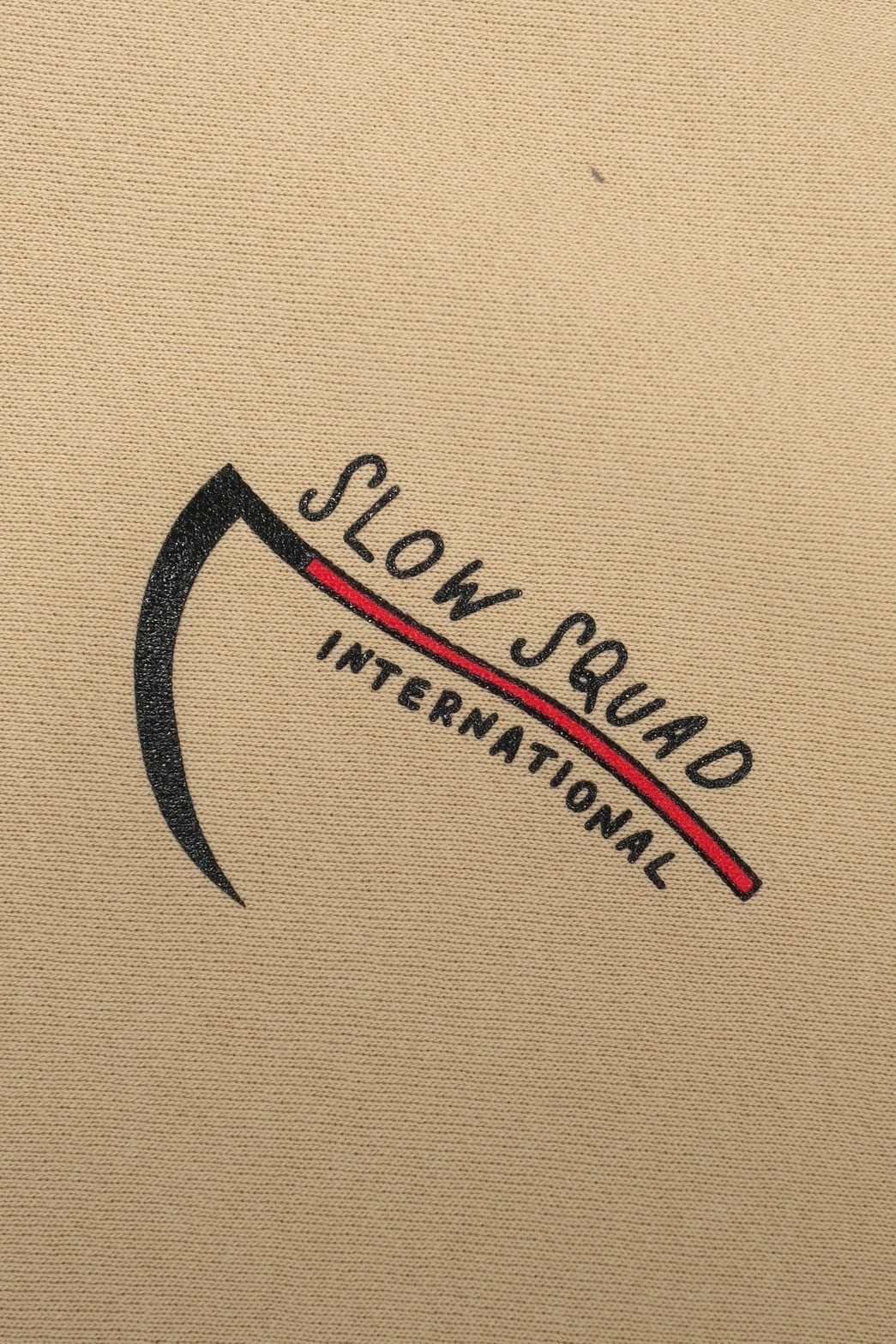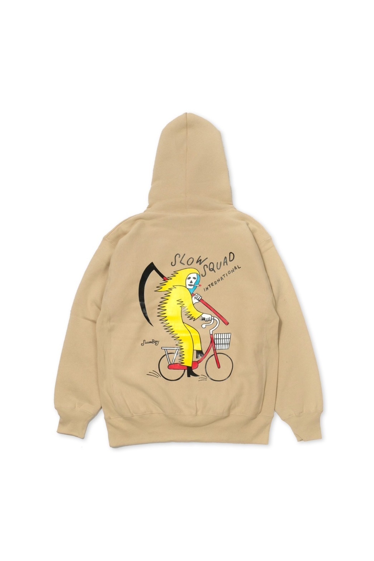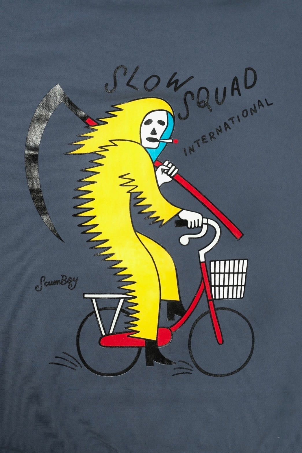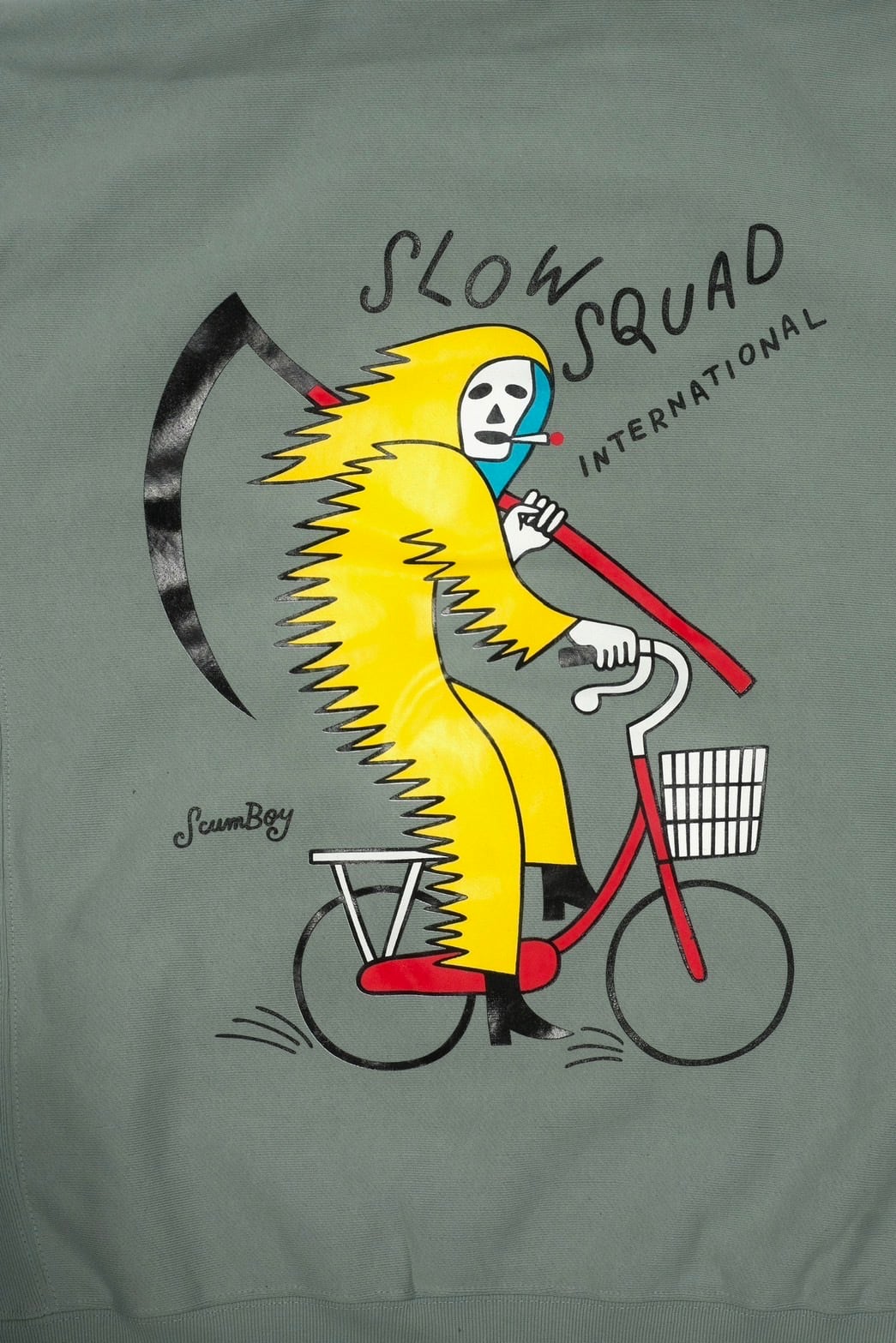 今年10周年を迎える世界30都市を繋ぐ宗教団体Slow Squadから、遂にその象徴ともいえるママチャリファイヤーの新作が降臨です。毎回ベストをさらにベストで更新するSCUMBOY氏のデザインはもはやGOAT!やっぱりやっぱりのヤばさなリッパーです、スクワッドも涙したじらしにじらされた大作なんです。オリジナルカラーのビビットで絶妙な配色はフロント3色、バッグに5色を大田区伝説の町工場、eipi inkが1枚1枚手刷りで魂をこめて製作。気合いの入りまくりでフーディーもしっかりヘビーオンスで12.0オンスの裏起毛パーカー。